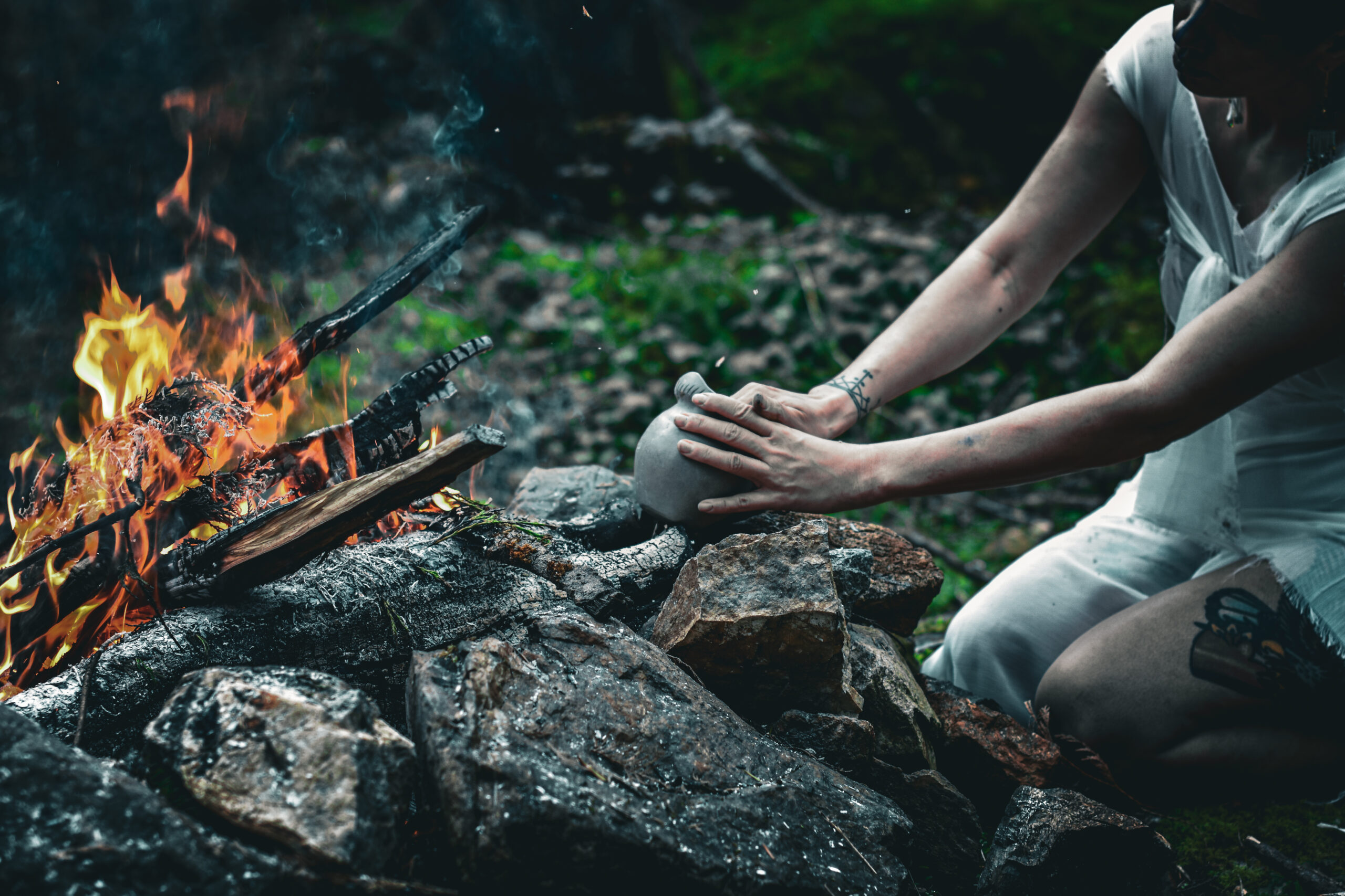 In Lindsay Katsitsakatste Delaronde’s Gemini: TEKENÍKHEN (twins) (2023), the artist conducts a ceremony in the forest: piling wood to exhaustion, spreading ashes onto her body, and finally, eating a single strawberry as nourishment. Katsitsakatste Delaronde’s laboured movements model the strengthening of body and mind in search of purpose.