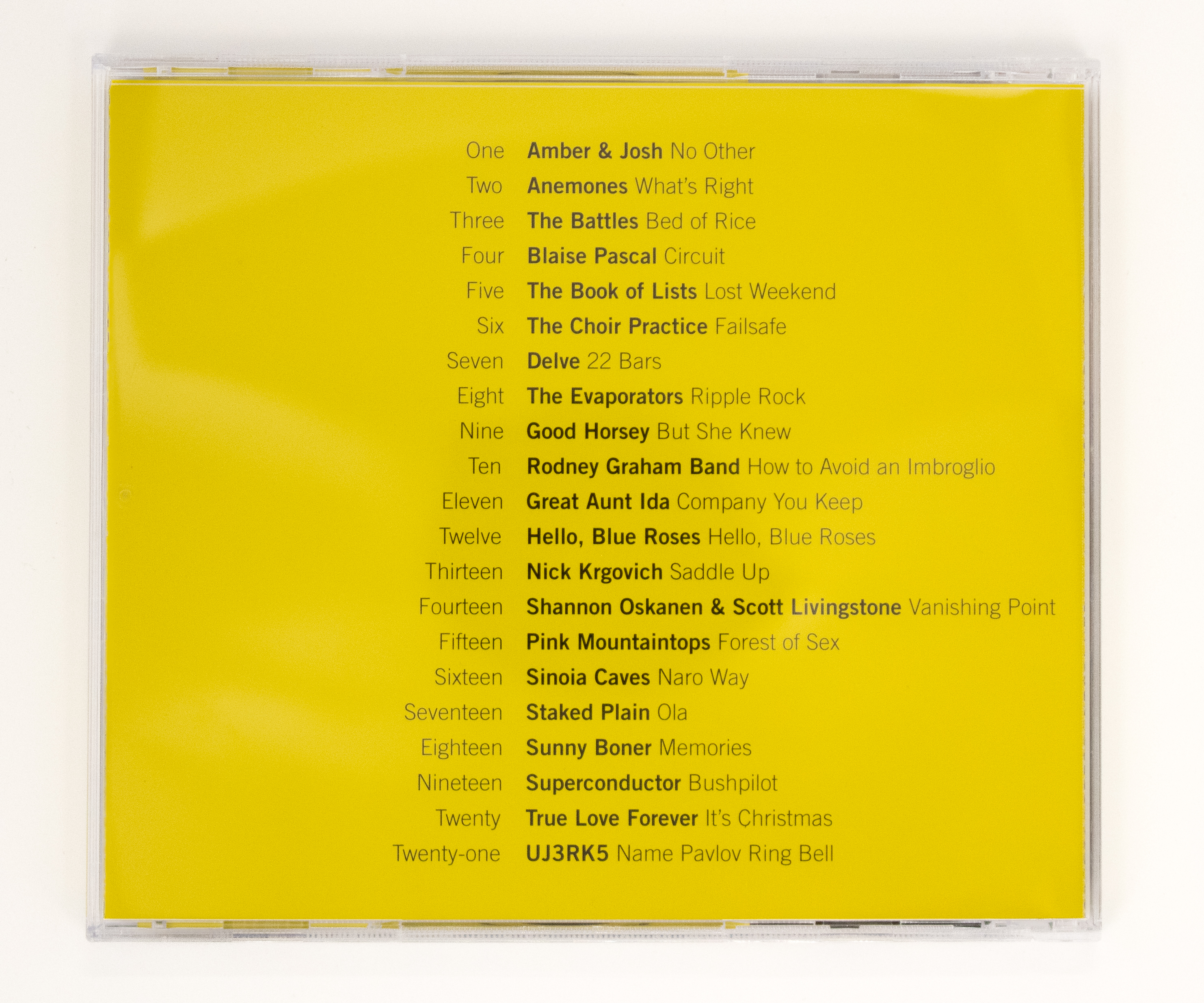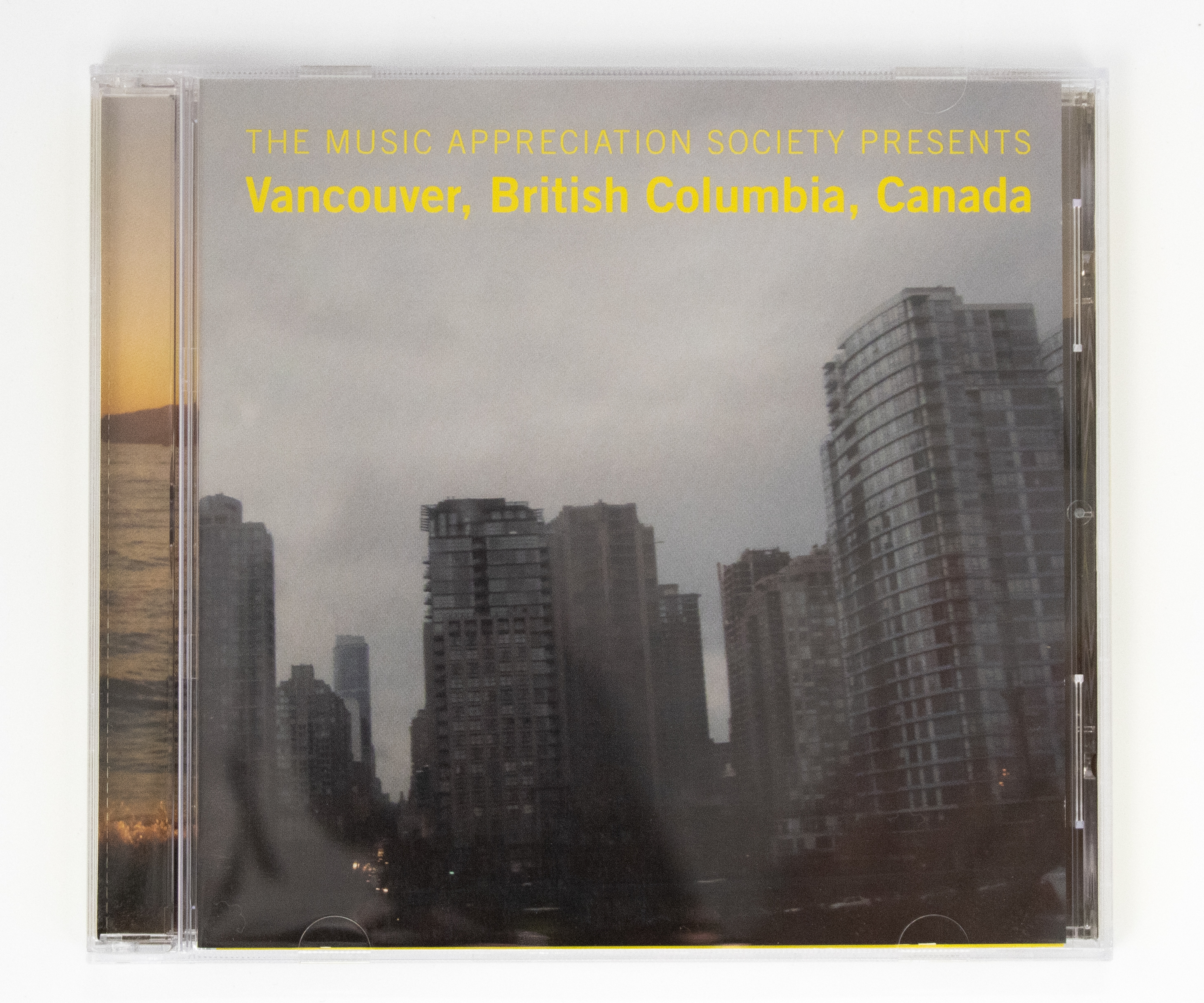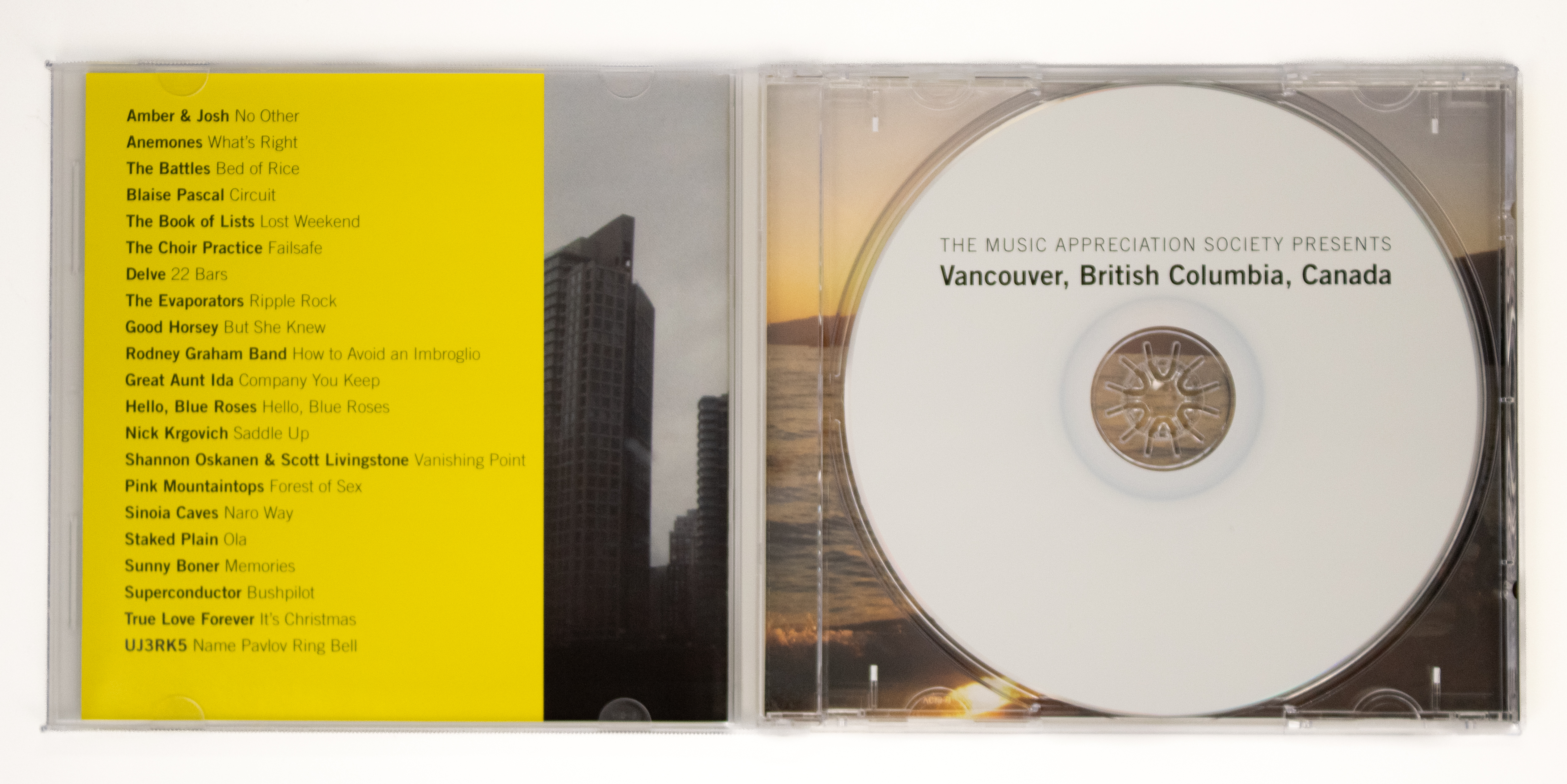 The Music Appreciation Society Presents: Vancouver, British Columbia, Canada is a CD compilation of songs recorded by local artists who are in bands and who use music in their practice. This project will make reference to the profound role popular music has played in the work of Vancouver artists in recent years. Contributing artists include: U-J3RK5 (a legendary Vancouver new wave band that includes Jeff Wall, Rodney Graham and Ian Wallace as members), The Rodney Graham Band, Hello Blue Roses (Sydney Hermant and Daniel Bejar), Pink Mountaintops, The Book of Lists, Kevin Schmidt, Damian Moppet, and more.